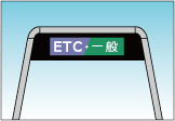 「事前案内板」は料金所エリアに進入する手前に設定されていて、ETCレーンの位置を示します。 ETC車は看板で確認し表示に従って料金所を通過してください